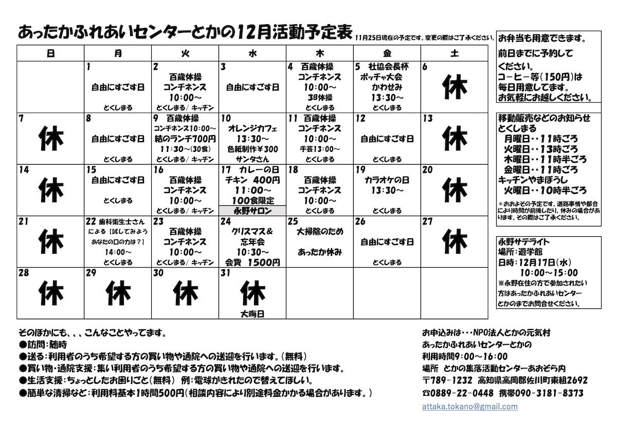 あったかふれあいセンターとかの12月の予定表を掲載しました。