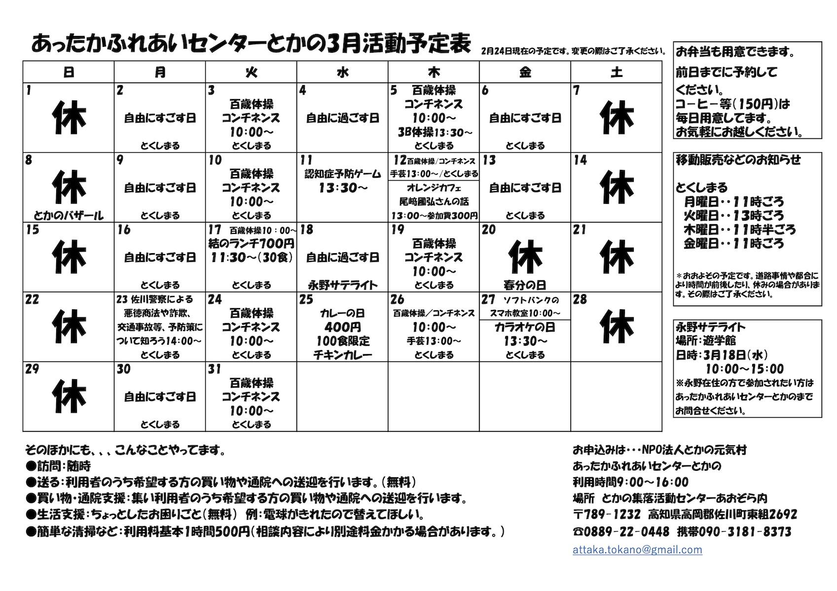 あったかふれあいセンターとかの2026年3月の予定表を掲載しました。